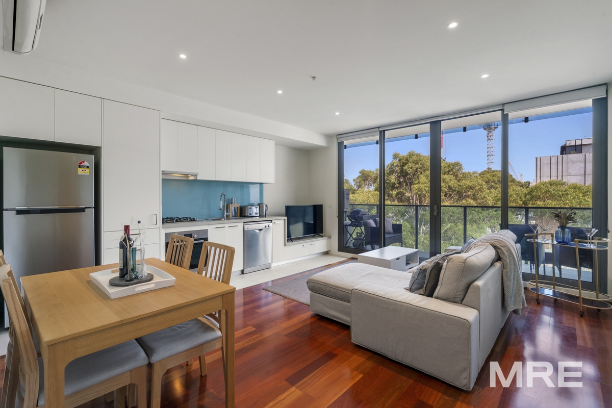 Embrace urban living in this sleek furnished 4th-floor apartment, perfectly positioned in vibrant South Yarra. Overlooking lush parklands, this contemporary retreat offers an open-plan living and dining area complemented by a stylish stone kitchen with Bosch appliances and ample storage. Double sliding doors lead to a spacious balcony, providing stunning views of a dynamic cityscape blending historic charm with modern elegance.