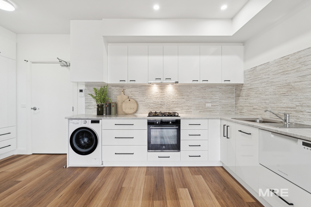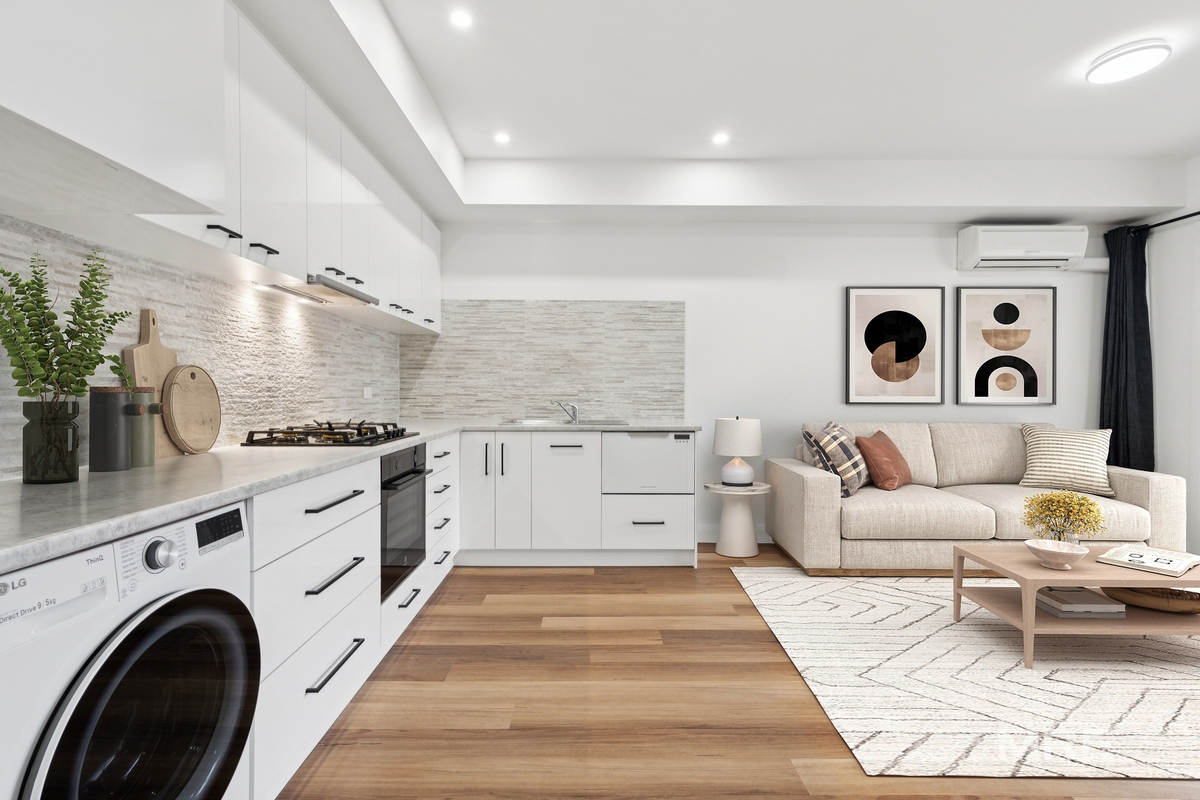 The contemporary kitchen is equipped with quality finishes, including a dishwasher and abundant storage, while year-round comfort is ensured with reverse-cycle air conditioning. The modern bathroom features clever design and practicality. A washing machine is included and positioned in the kitchen.
