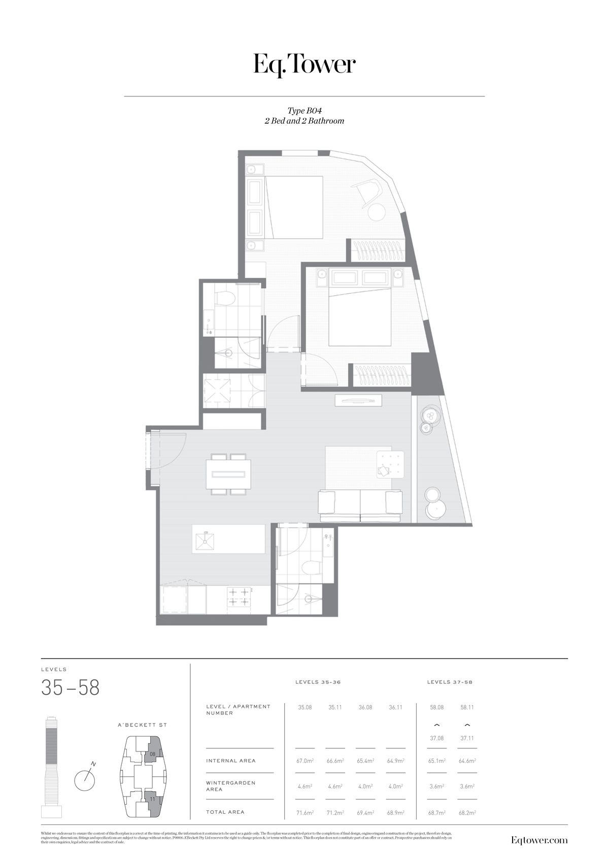 This stunning two bedroom apartment has been meticulously designed and built to service every need of inner CBD living. The generous-sized living room is filled with natural light and flows onto the balcony with views throughout the CBD and suburbs. The kitchen is state of the art with stone benchtops, an abundance of pantry space and stainless steel appliances including a full oven, 4 burner gas cooktop and dishwasher. The bedrooms are filled with an abundance of natural light and enjoy spectacular views across Melbourne, offering room for a generous-sized bed with bedside tables and mirrored built-in robes. EQ Tower apartments are fitted with designer bathrooms offering plenty of space and are complete with a Euro laundry.